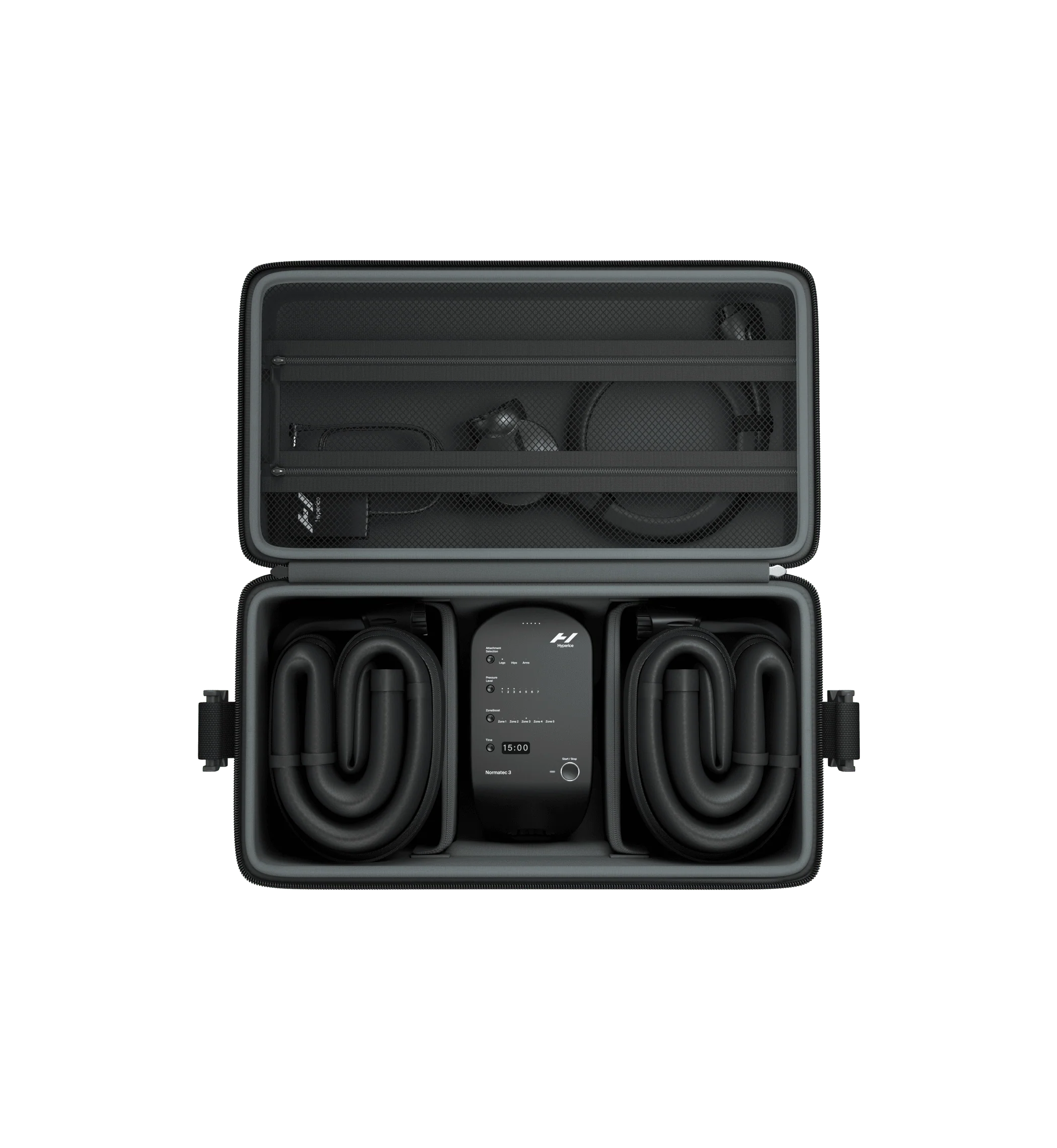 Custom designed case to fit your Normatec 3 recovery system. Easily pack your control unit, hose, power supply and all system attachments.